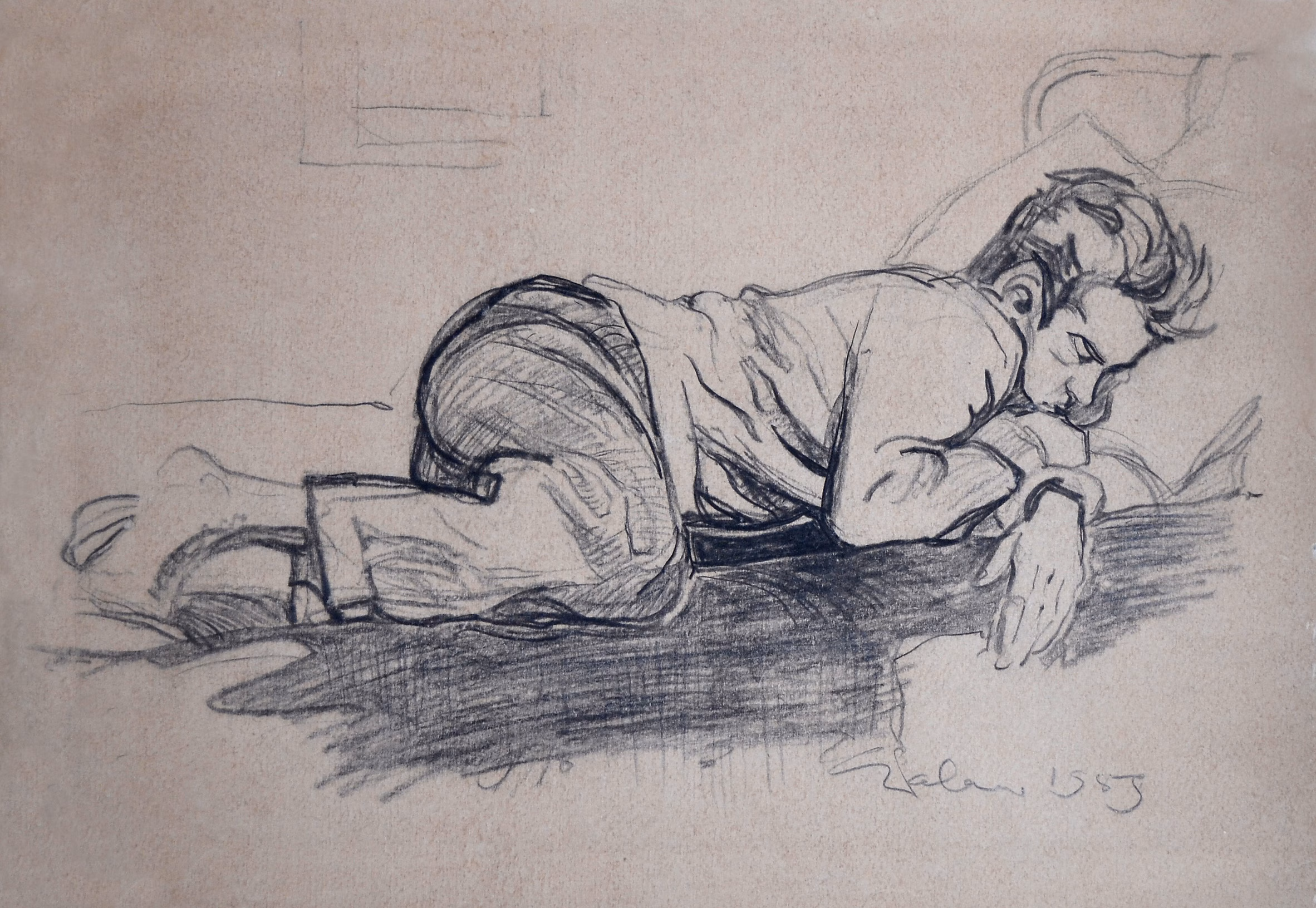 Antsu päevane uinak Uue tänava ühikas. Endel Palmiste joonistus 1959. aastast.
