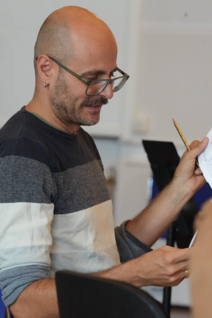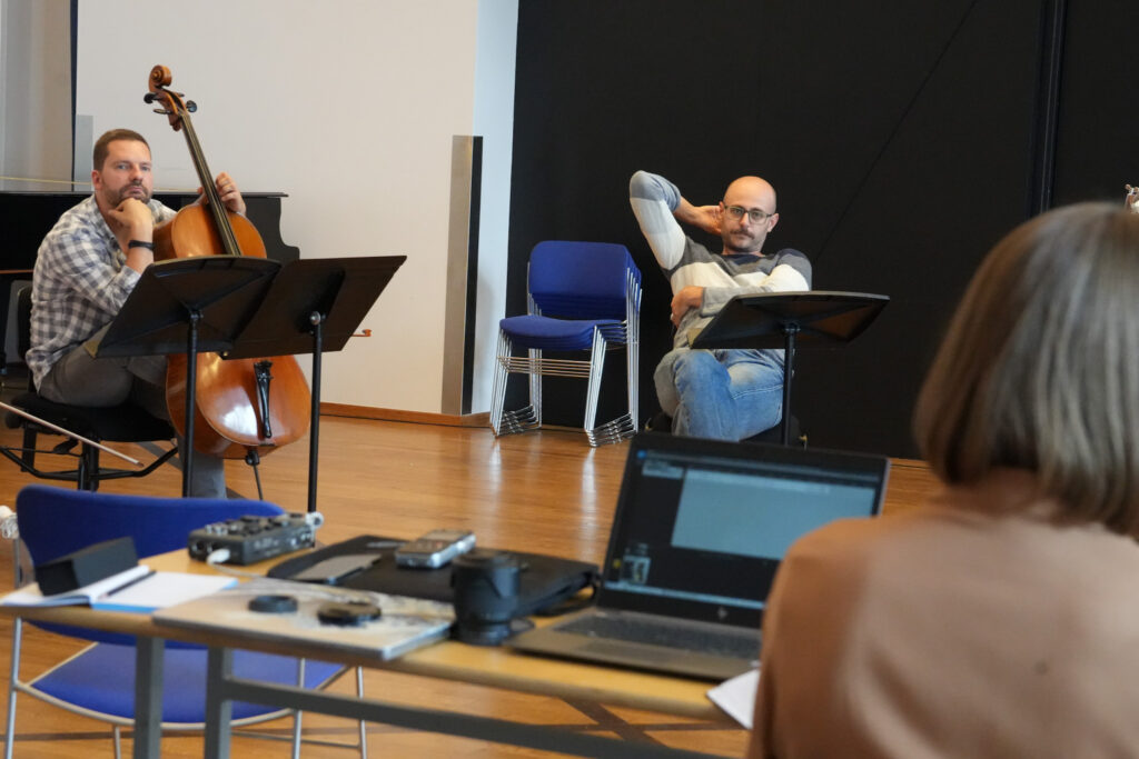 Hetki residentuurist: ansambli U: tšellist Levi-Danel Mägila ja Nicholas Tamagna kuulamas helilooja Liisa Hõbepappeli (paremal) näpunäiteid.
