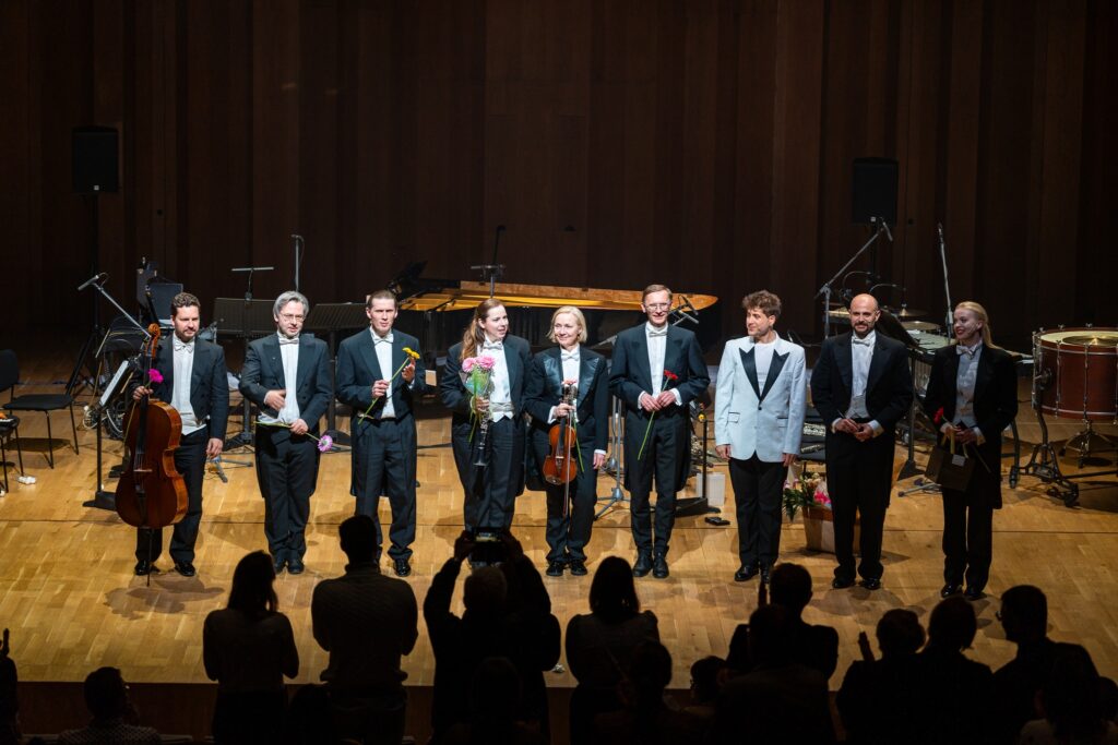 Liisa Hõbepappeli kammerooperi „Põrmuline” esitajaskond esietenduse järel mais 2025 Viimsi Artiumis publiku ovatsioone vastu võtmas.