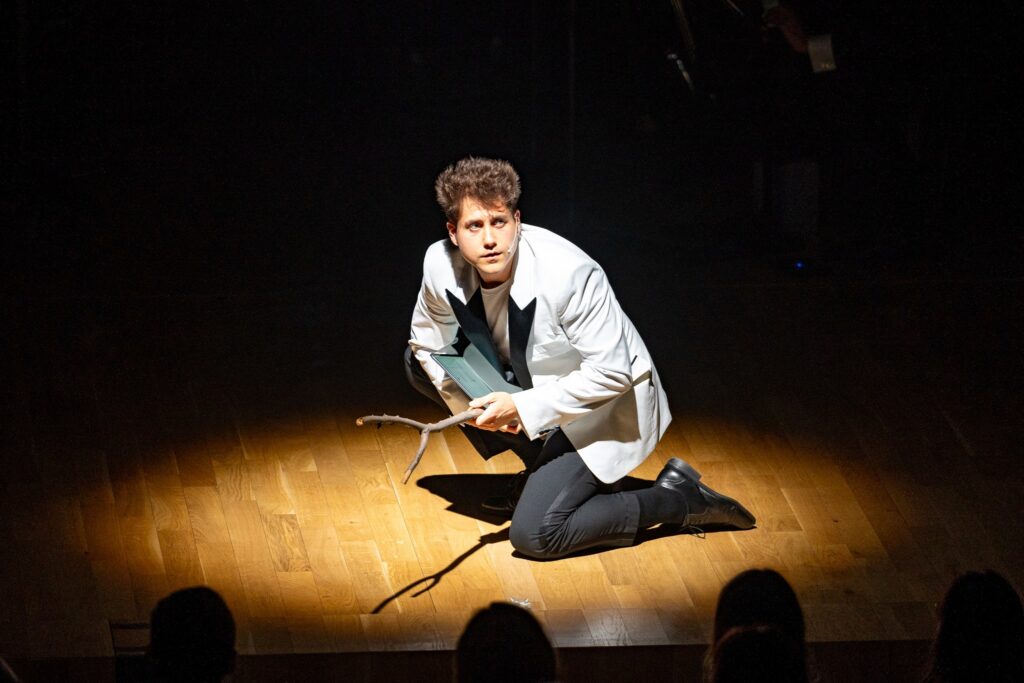 Esiettekandel oli mõjuvaim osa teose finaal alapealkirjaga „Mets”, mis andis kuulajale aimu, kui vajalik on pikaajaline ja süvendatud kontakt mahuka teosega. Sel hetkel jõudis esmakordselt lavale vokalist Ryan Adams. Adamsi näol on tegemist muusikuga, kes lõpetas klassikalise heliloomingu eriala magistriõppe ja õpib parajasti audovisuaalse loomingu erialal, tema CVs märgitakse, et ta on ka vokalist. Ooperiga, nagu öeldud, puutus ta kokku juba 2024. aasta suvel, pool aastat hiljem osales ta katkendi esitamisel ansambli U: kontserdil ning nüüd teose esiettekandel. Partituurist võib lugeda helilooja remarki: „Siis vanamees läks metsa hulkuma”. Esietendusel istus Adamsi tegelaskuju staatiliselt lava äärel (see võimaldas tal ilmselt jälgida rahulikult nooditeksti). Oma läbivalt fokuseeritud esituslaadiga ja tõenäoliselt ka hea muusikalise materjali tabamisega — ilmselt tänu sellele, et ta ise tegeleb heliloominguga — tekitas ta minus mõtte, et kammerooperi oleks võinudki üles ehitada Adamsi esituslaadi silmas pidades. (Hilisemal videosalvestuse üle vaatamisel mõjusid ka teised lauljad märksa ehedamalt, kui mäletasin neid saalis saadud kogemusest.) Adamsi esitus jätab mulje, et tema ongi ooperi peategelane, kes ilmub lavale alles viimaseks kümneks minutiks, nagu eelneva protsessi tulemusel tekkinud uus nähtus või kese narratiivis. Muljet võimendab tegelaskuju kostüüm — vastandina eelnevatele kostüümidele, milleks on range must frakk ja valge pluus, on Adamsi tegelaskuju riided valged, kuid reväärid mustad (must värv mõjub mälestusena mehe eelmistest seisunditest). Valgus on suunatud tema peale, muusikud on jäänud hämarusse. Lava seintele kuvatavas videos liikusid tol hetkel minu mäletamist mööda puuokste varjud, mis meenutasid mõnevõrra kägistavaid käsi. Siit võiks leida vihje, et kägistamine on inimeste tegevus, mis on vastuolus kõige loomuliku, algupärase, looduse, metsaga. Mets tundub siin sümboliseerivat eestlaste ürgset olemust, mida sügavuti on osanud analüüsida ja sõnades edasi anda Valdur Mikita (mh „Lindvistika ehk metsa see lingvistika”, 2015). Alaosa „Mets” mõjub ooperi apoteoosina, aga ka palvena või appikarjena, sest Adamsi vokaliisi kujul kostab partiist välja sõna please.