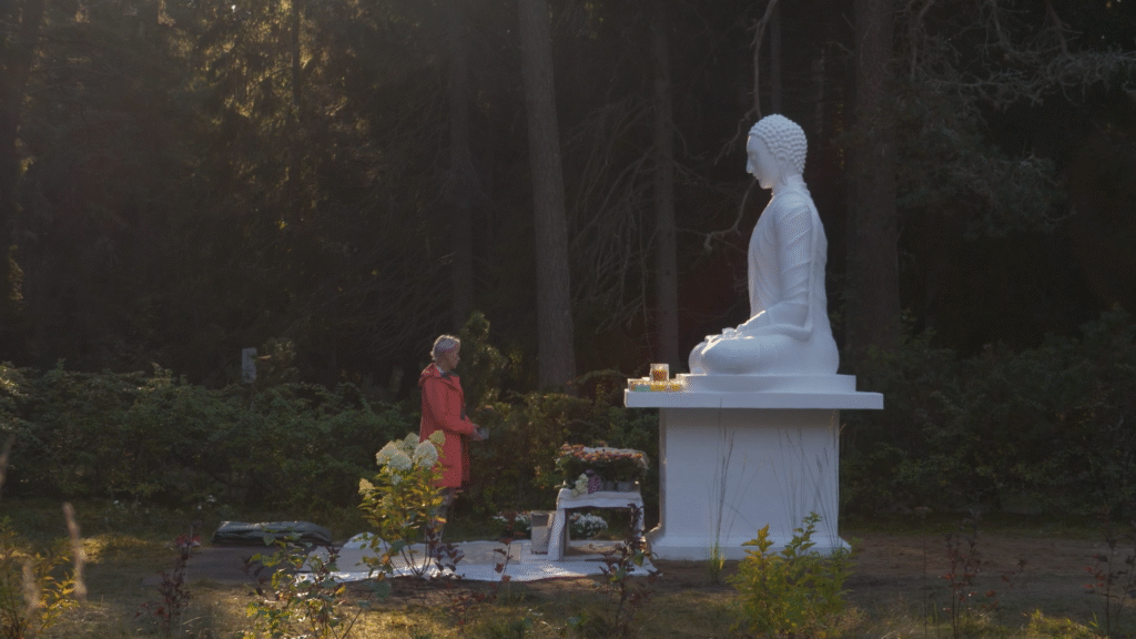 Baltikumi suurim Buddha kuju päikeseloojangul. Episoodist „Kannatusest vabanemise tee”.