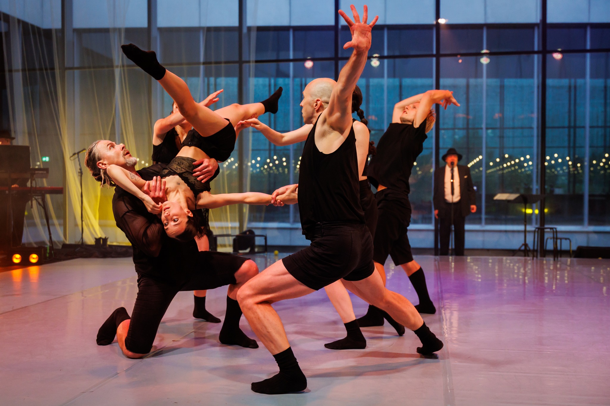 Neljas partner selles loos on muusika, mis sünnib igal etendusel kohapeal. Helilooja Liisa Hirsch on justkui dirigent-lavastaja, kes annab lavastuseks komponeeritud partituurile ja ruumis toimuvale iga kord uuesti hinguse ja sobiva rütmi. Nii täidab ta ühelt poolt tantsijaid kuulava ja nendega dialoogi pidava dirigendi rolli, teisalt vastutab justkui lavastaja stseenide dramaturgilise kestvuse eest, hoiab lavastuse kulgemise pulssi. Varjundirohke helimaastik ulatub saatemuusikast džässini. Muusikas ei ole kõrvu jäävaid meloodiaid, mistõttu see ei hakka ka domineerima, vaid on tantsijatele toetav partner. Džässihelid viitavad küll algmaterjali ajale (1940. aastad) ja kohtadele, kuid hakkasid meie vaatajakogemuses suunama koreograafiat.