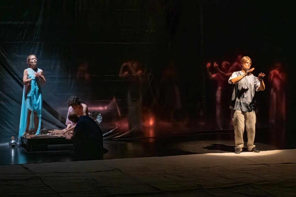 Festivali avaetendusel „The Rise” alapealkirjaga „Žesti kõla” sain teada, et on olemas eraldi rahvusvaheline poeetiline viipekeel (Poetry Sign), ja seda ka nautida. Viipekeelse mittekuuljast jutuvestja Ruben Granditsi žestid olid plastilisemad, suuremad ja hõlmasid palju rohkem kogu keha kui harilik viipekeelne vestlus või tõlkimine. (See viimane on teinud nii mõnigi kord põnevamaks muidu ehk halli ja ettearvatava teatritüki jälgimise.) Granditsi puhul oli liigutuste dünaamiline skaala väga lai ja kuna viipekeele mitterääkijatele kuvati enamasti seinale inglis- ja saksakeelset tõlget, tundsin palju rõõmu mõistete ja liigutuste kokku viimisest. Tema jutustatud tekst, mis põhines luuletaja Louise Glücki müütilise sisuga tsüklil „Averno”, sai lavastuse muusika ja liikumiskeele lähtepunktiks. Muusikat tõlgiti motiiviteooriapõhiselt ka tagasi visuaalseteks märkideks. Helilooja Eva Reiter, kes osales ka lavastajana, kasutas vibreerivaid põrandaplaate ja enda välja arendatud spetsiaalseid instrumente, nagu hiiglaslik poognatega mängitav monokord, orelilaadne lõõtsaga toimiv pill, ning ka tuntumaid, nagu metallpulgad või plasttorud (mängijateks Ictus Ensemble’i muusikud). Jutuvestja viiplevate käte külge olid kinnitatud mikrofonid ja sensorid, millest saadav info transformeerus elektrooniliseks helitaustaks. Osalesid tantsijad (koreograaf Michiel Vandevelde), kes liikusid samuti neil plaatidel, teose lõpus kõlas sopranisoolo koos viipepoeesiaga. Vahepeal viiplesid kõik etendajad koos, hoides näo ees suurendusklaase, et juhtida tähelepanu sellele, kui oluline osa on viipekeeles näoilmetel.