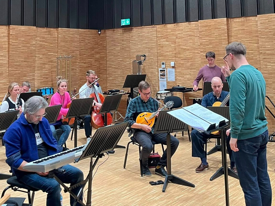 Tarmo Johannes ja Taavi Kerikmäe (vasakul, ansambel U:), dirigent Kaspar Mänd ja Ludensemble kontserdi proovis. Krista Mölderi foto