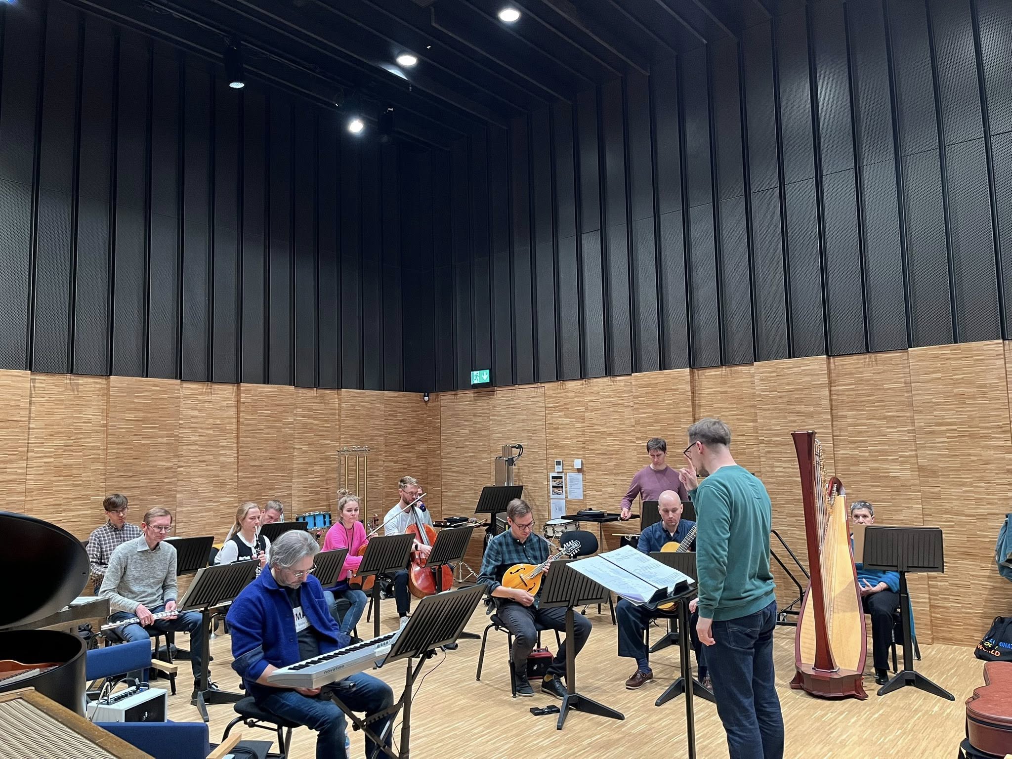 Tarmo Johannes ja Taavi Kerikmäe (vasakul, ansambel U:), dirigent Kaspar Mänd ja Ludensemble kontserdi proovis. Krista Mölderi foto