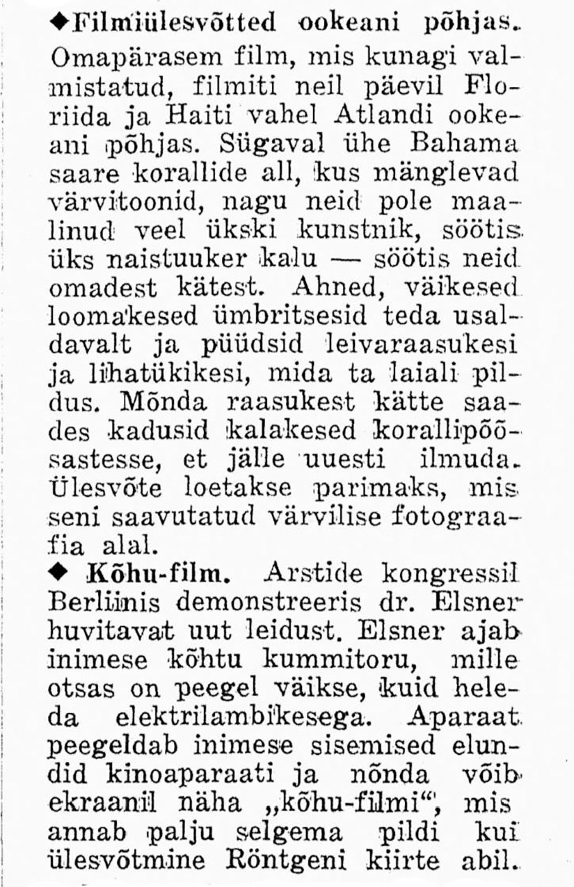 „Vene filmitööstus tegi esimesi samme 1910. a. ümber ning sisseveo takistuste tõttu sõja ajal võitis enam pinda. Ka meie kodumaal tehti siis juhuslikke ülesvõtteid, iseäranis Pathe ja Gaumondi shurnaalide korrespondentide poolt. Üks Riia firma valmistas