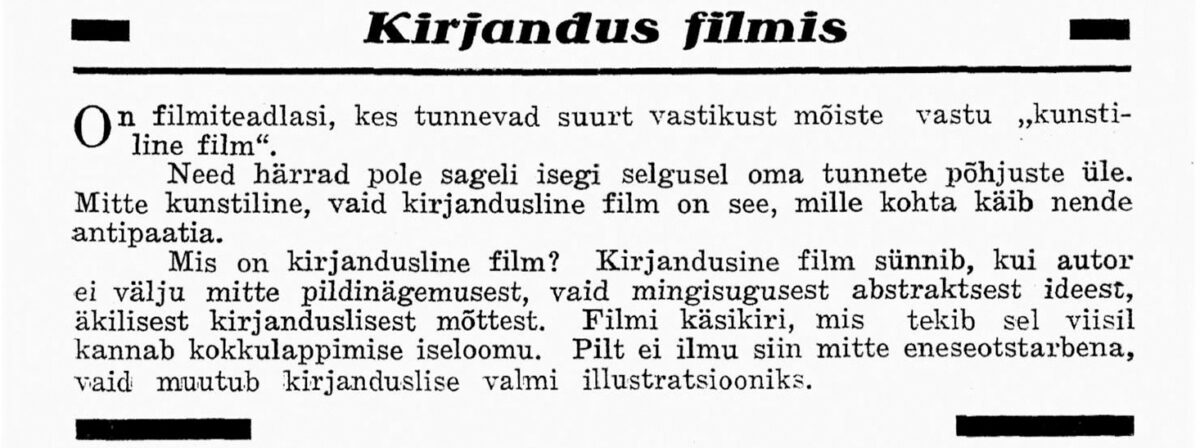 Kusbock kirjutab avanumbrisse artikli „FilmKunst”, kus räägib vanade traditsioonide (kui need üldse olemas olid) murdmisest: „Luuakse uued — puhtkunstilised traditsioonid. Filmi alal töötavad suurimad kunstnikud sõna tõsises mõttes. Ikka kindlamaks saab arusaamine, et vana pahn peab ümbertöötatud saama.” Seda „vana pahna” esialgu veel eriti palju ei olnud, nii et ümbertöötamine polnuks suur töö. Ehkki filme tuli, oli eesti film siiski veel kujunemisjärgus ja habrastel alustel. Paljud väikesed firmad võtsid entusiastlikult filmitegemise ette, lootes kasule, aga seda ei tulnud.