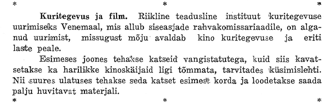 „Võime märgata, et oleviku kinoga ei ole asjad täiesti korras. Paljud ei ole temaga rahul ja tast on kõneldud väga palju, kuid pigemini halba kui head. Näib, nagu ei ole oldud erapooletu, näib, nagu oleks asja hinnatud liig schablooniliselt. Ühed on vaadanud kino kui Monte-Carlo mängupõrgu peale. Teised jälle on olnud tast vaimustatud, kino on olnud nende hing ja nende äripäevaelu kõneluseks on: Lähme kinno! Viimaste hulgas on neid, kes kinos käivad huvi ja ajaviite pärast. On olemas aga ka neid, kes igapäev poole ööni kinos istuvad ja kelle elus peale söömise ja joomise muud midagi ei ole kui kino. Need on kinohaiged kinomaanid, nagu on olemas raamatuhaiged bibliomaanid,” nendib Aleksis Krahe artiklis „Kino osa vabaharidustöös” (Filmileht, nr 9, 1927).