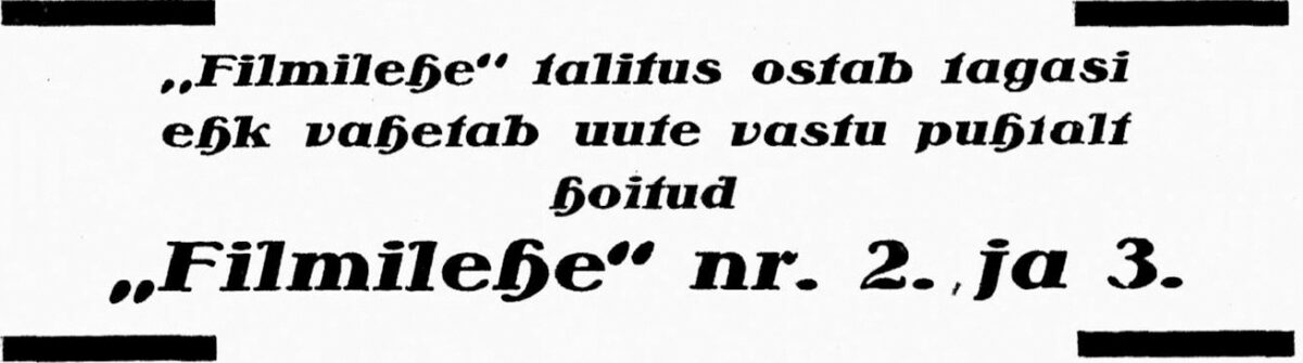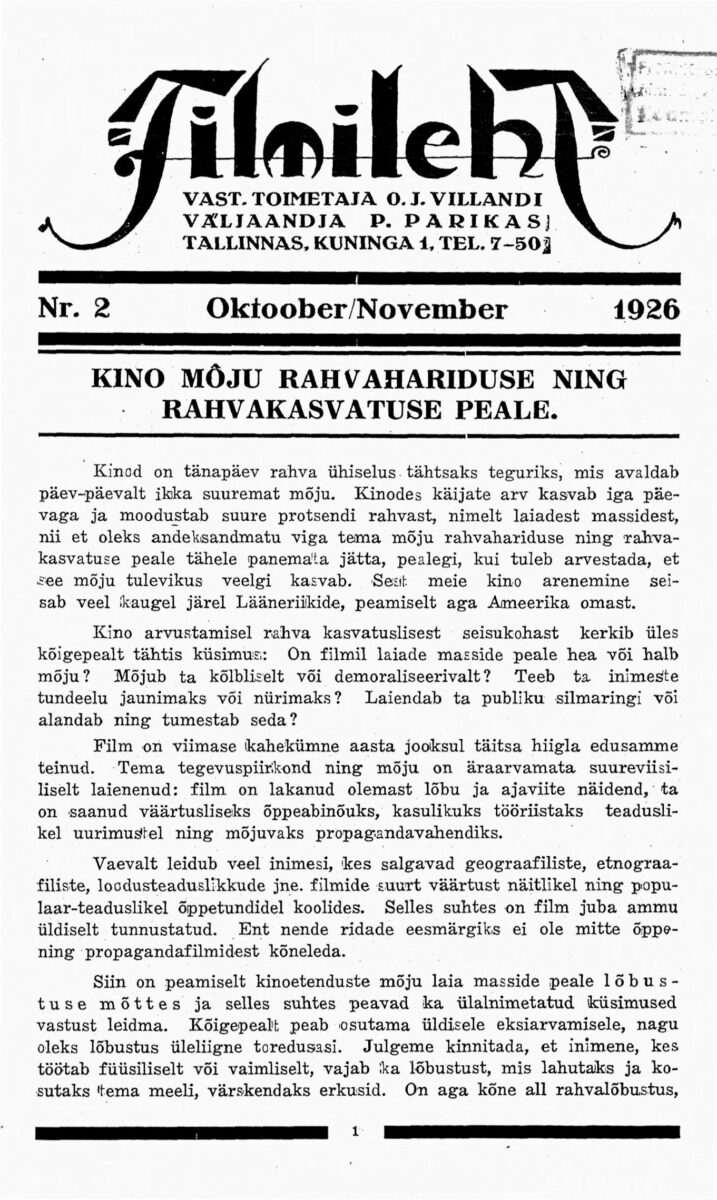 Tänavu saab eesti filmiajakirjandus 100-aastaseks. Selle alguseks peetakse Filmilehe esimese numbri ilmumist 1926. aasta augustis. Filmileht oli esimene regulaarne filmiajakiri, mida ilmus kokku 23 numbrit kuni aastani 1931. Seda andis välja foto- ja filmiettevõtja Peeter Parikas, vastutav toimetaja oli esmalt Oskar Johann Villandi, alates 3. numbrist Johannes Mülber, tollal rahvusvaheliselt tuntud eesti fotokunstnik.
